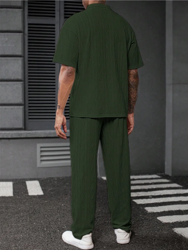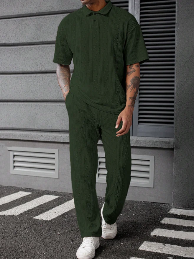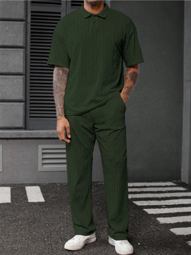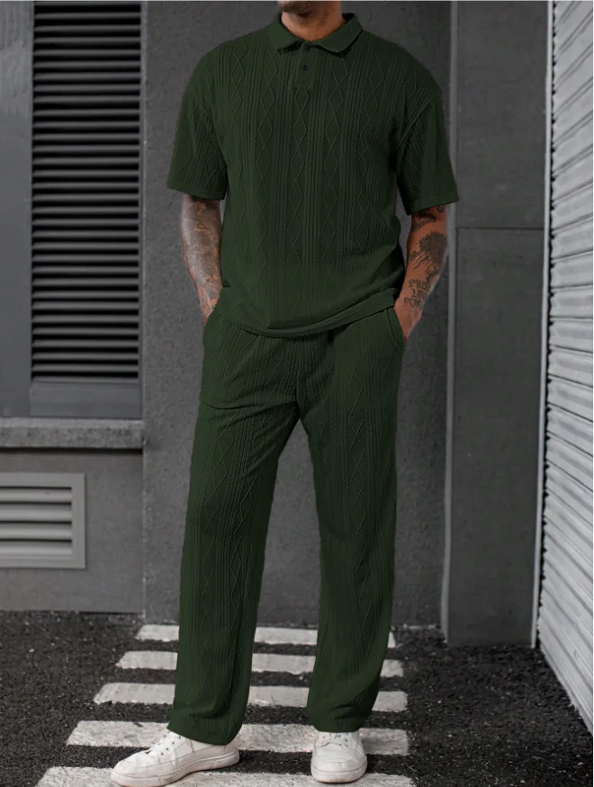 This two-piece set includes a polo shirt and pants, making it a convenient choice for any occasion.